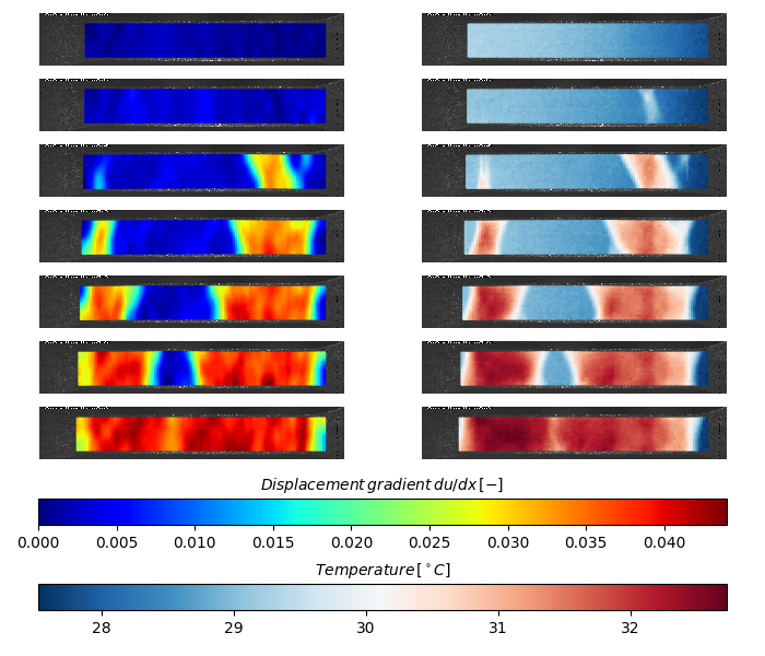 The output database can be viewed using the matplotlib library. The following script displays the displacement gradient and temperature for the same instant of time.